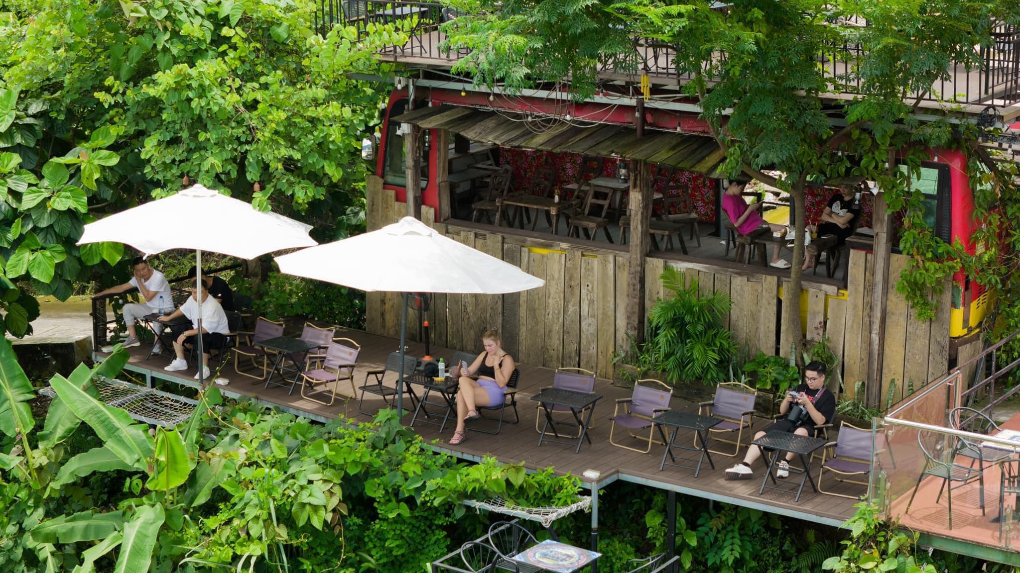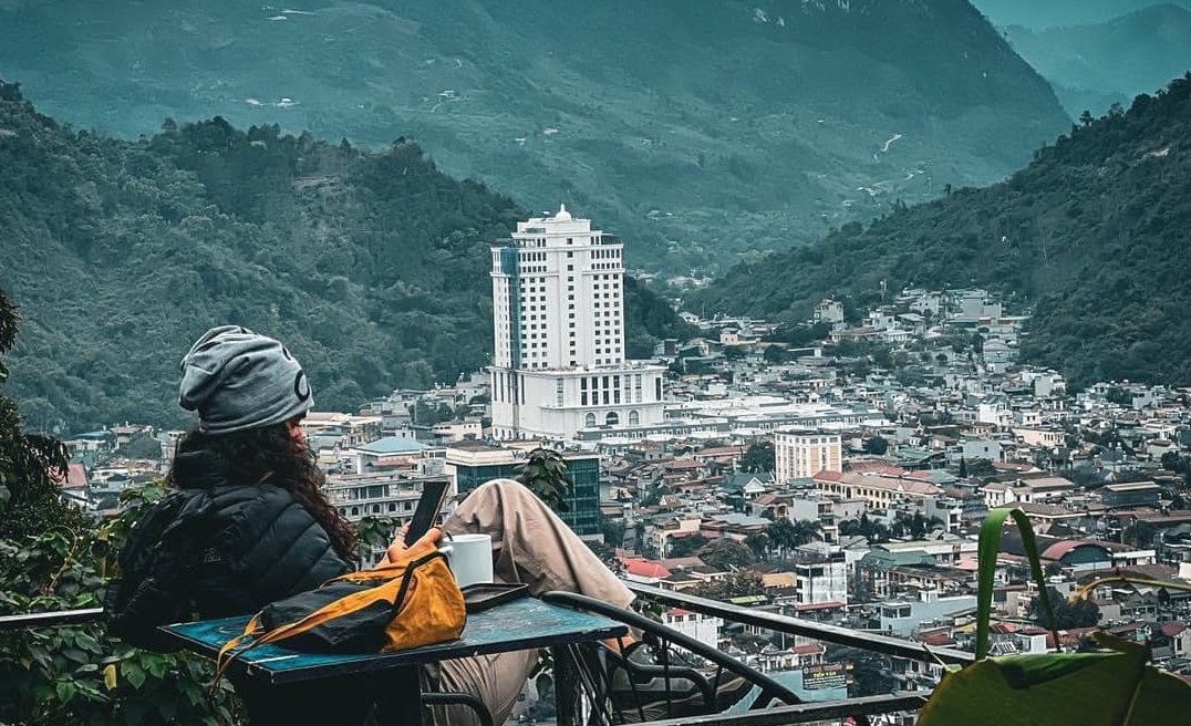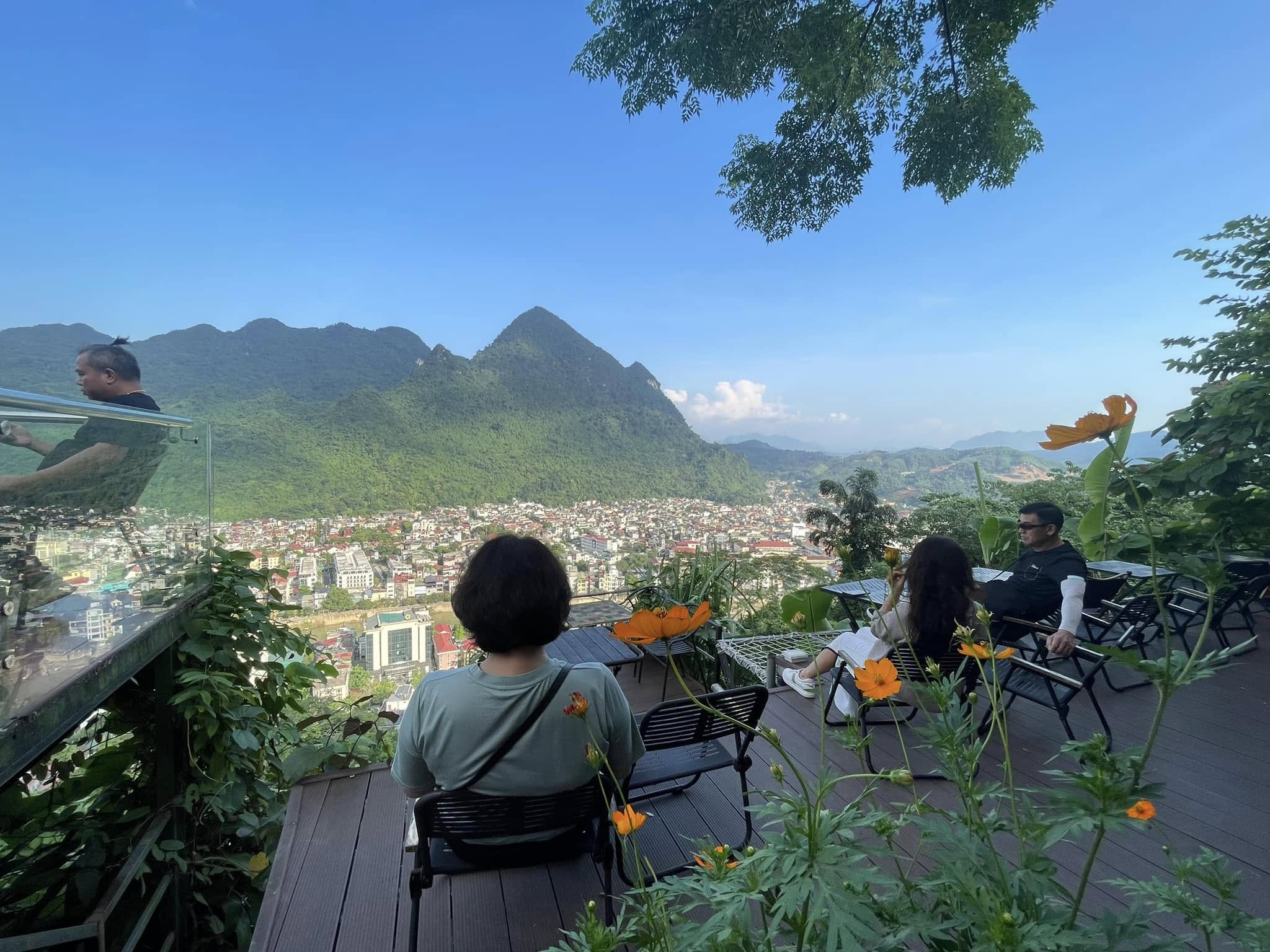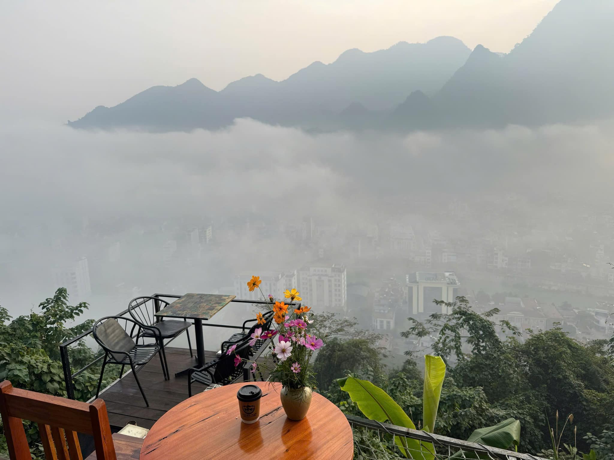 Không gian quán được thiết kế mở, sử dụng nhiều chất liệu gỗ và tre, mang hơi thở mộc mạc, gần gũi với thiên nhiên. Mỗi góc nhỏ đều được chăm chút tỉ mỉ: từ bộ bàn ghế gỗ giản dị, những chậu hoa dại xinh xắn, cho đến ban công rộng nhìn ra thung lũng, nơi du khách có thể tận hưởng trọn vẹn không khí trong lành của vùng núi. Khi sương sớm còn vương trên mái lá hay khi hoàng hôn buông xuống, cả quán như được bao phủ bởi một vẻ đẹp bình yên, lãng mạn.