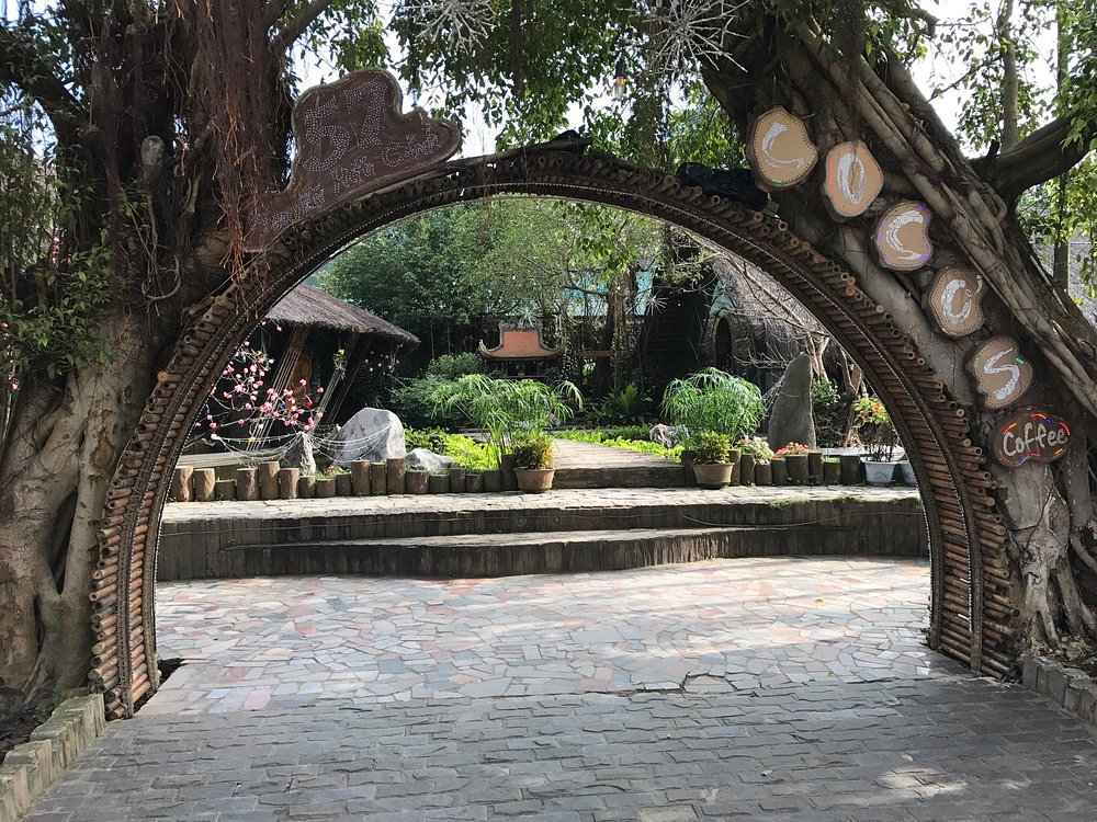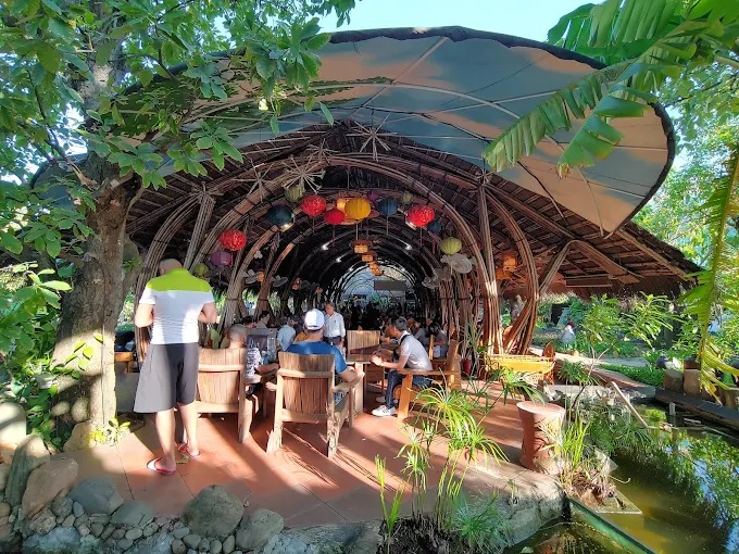 Bên trong quán được chia làm rất nhiều không gian cả trong nhà và ngoài trời. Những chiếc bàn nhỏ được đặt xung quanh hồ nước, dưới những mái tranh đơn sơ, mang đậm văn hóa truyền thống của người Việt. Bên cạnh đó, quan thiết kế rất nhiều tiểu cảnh với cầu đá, cây cảnh, những chiếc xích đu nhỏ xinh, con đường mòn với hai bên là những bông hoa dại xinh xinh, những căn nhà mái vòm độc đáo v.v. Vì thế đến đây bạn sẽ có rất nhiều góc sống ảo chất lượng, tha hồ chụp choẹt.